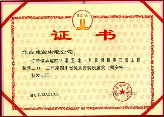 2012年度四川省优秀安装质量奖(蜀安杯)