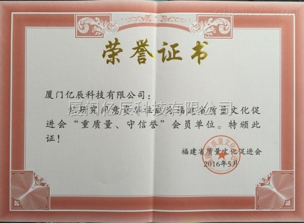 福建质量文化促进会“重质量 守信誉”会员单位-荣誉证书