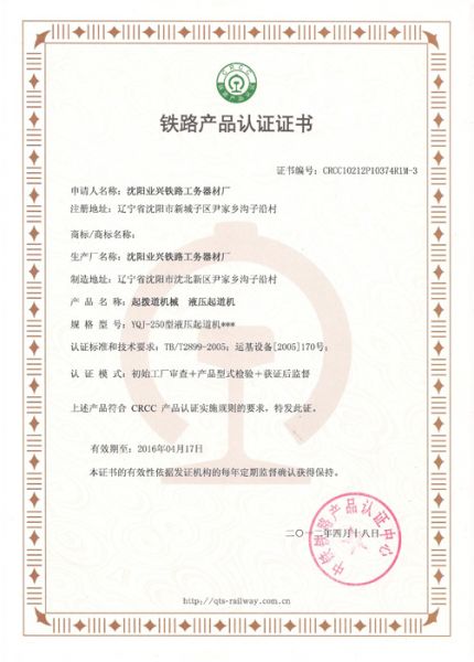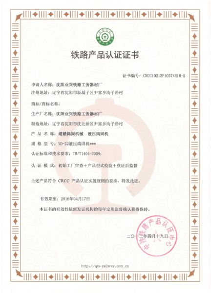 铁路产品认证证书2